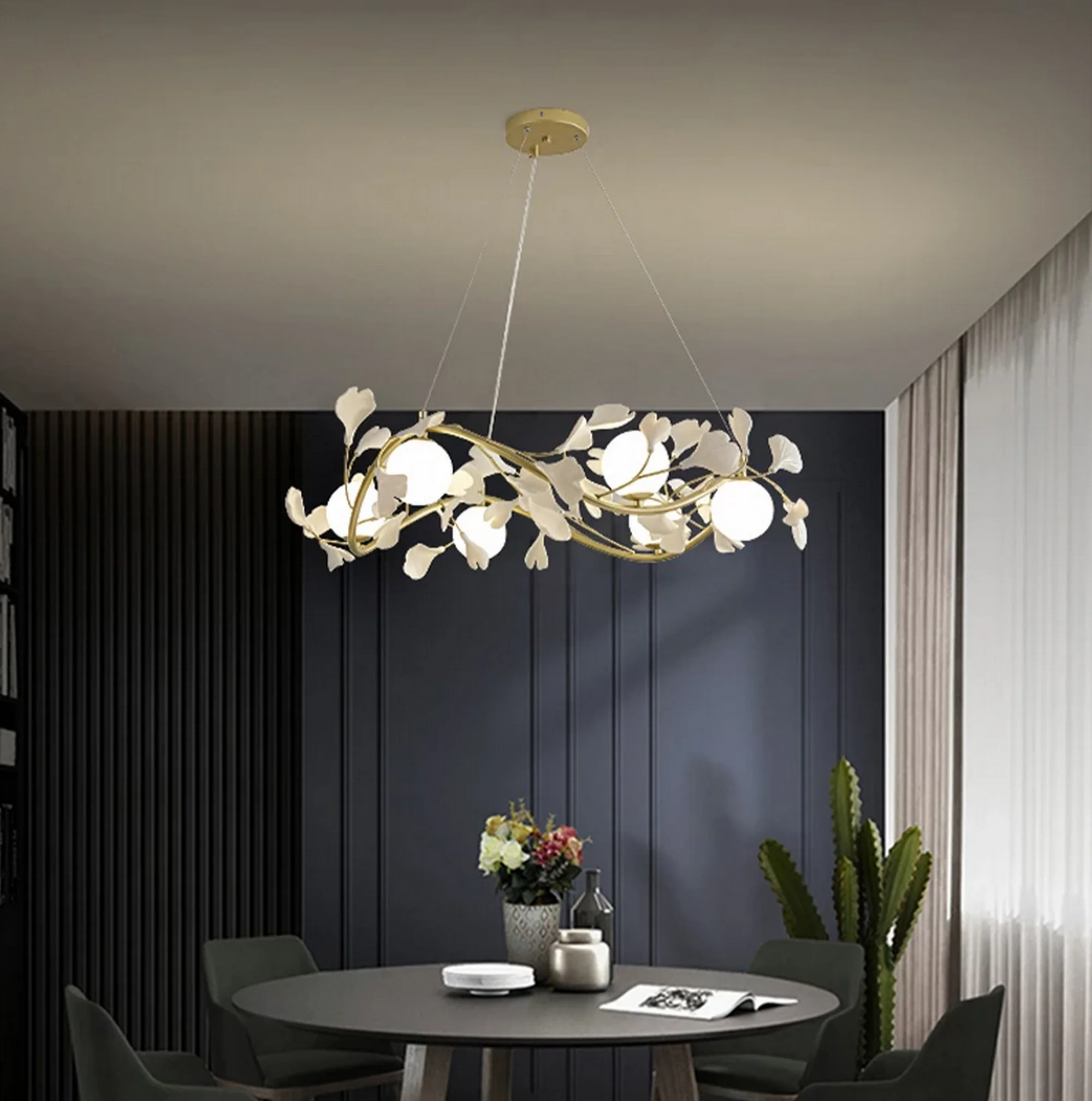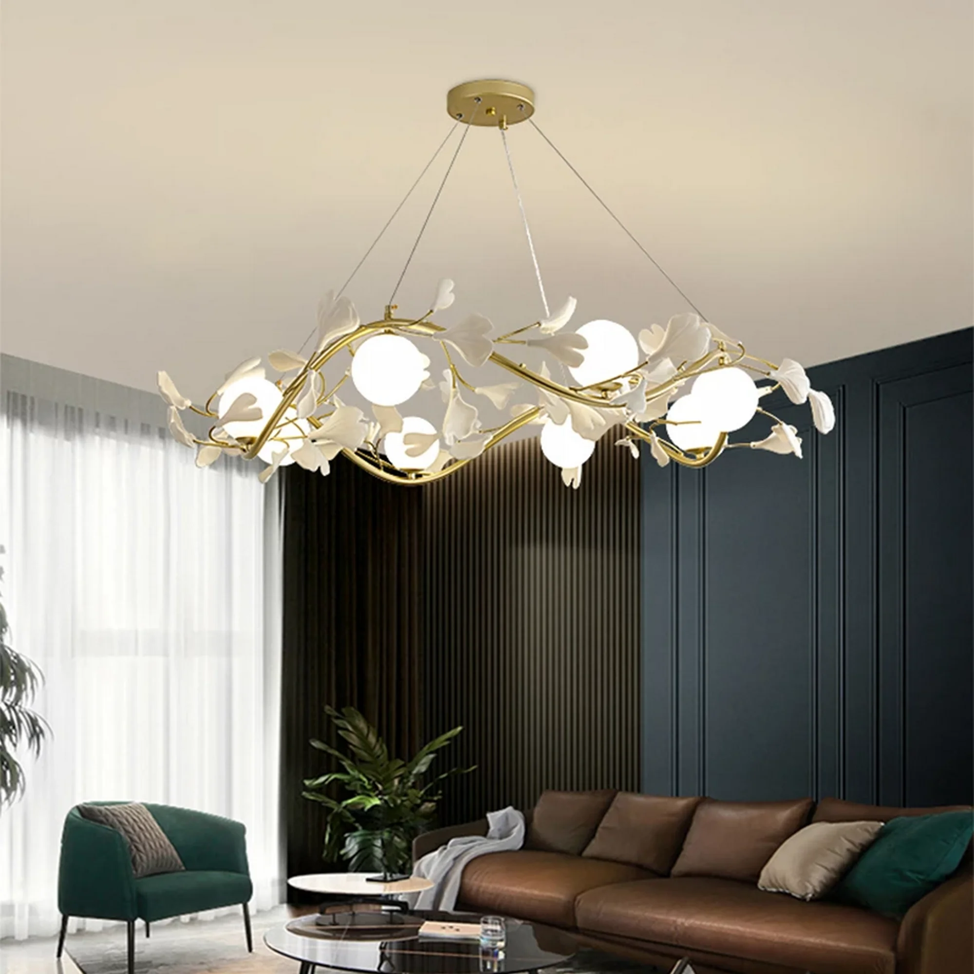 Crafted with utmost precision and an eye for detail, this mesmerizing chandelier showcases a delicate symphony of blooms and leaves, tastefully arranged to create a breathtaking centerpiece. Radiating a soft, enchanting glow, it sets the perfect ambiance for any room, whether it be your living space, dining area, or even a luxurious boutique.