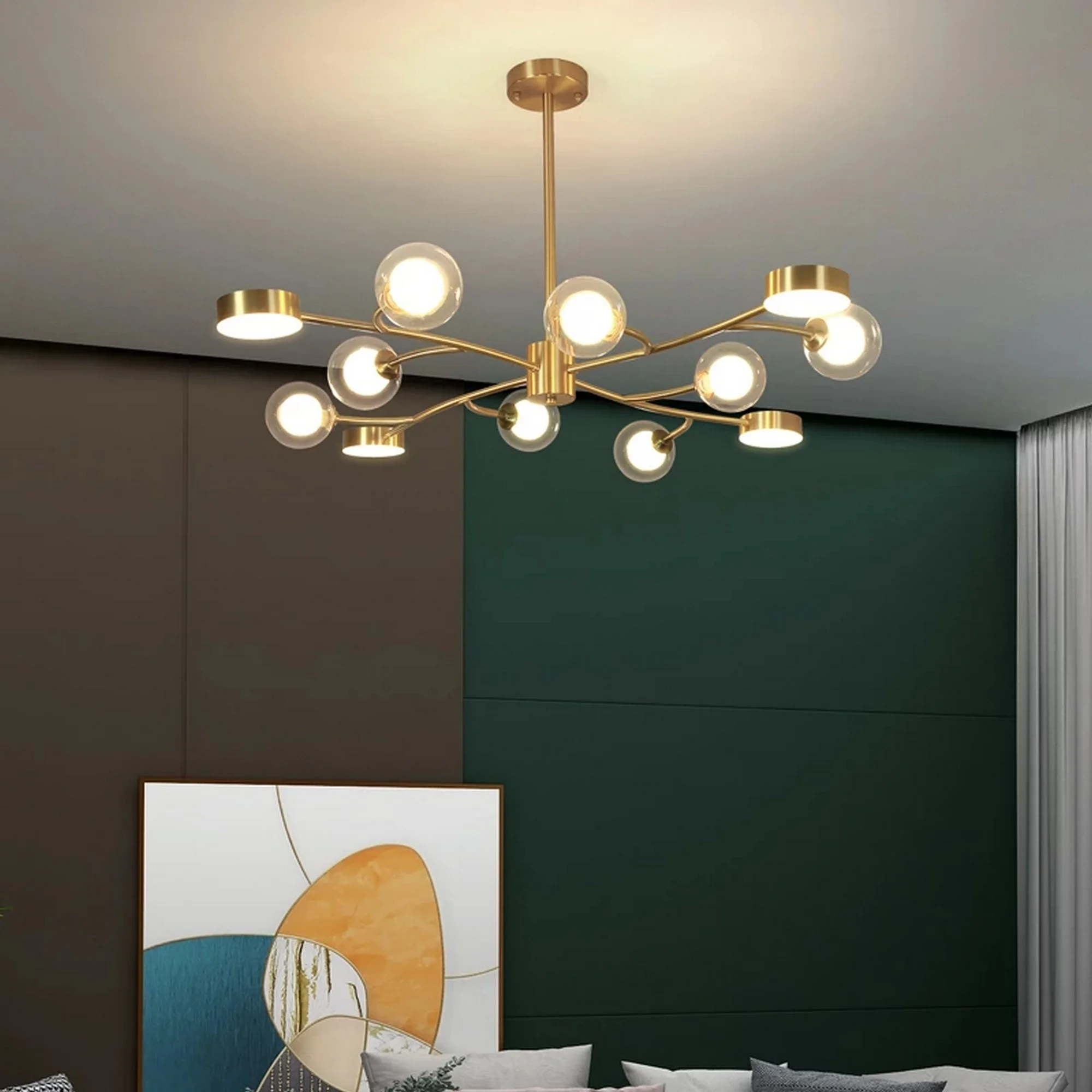 Crafted with meticulous attention to detail, the chandelier’s golden copper finish exudes luxury while seamlessly blending with the clean lines of Nordic design. The embedded LED lights cast a warm, inviting glow, creating an ambiance that’s both welcoming and enchanting.
