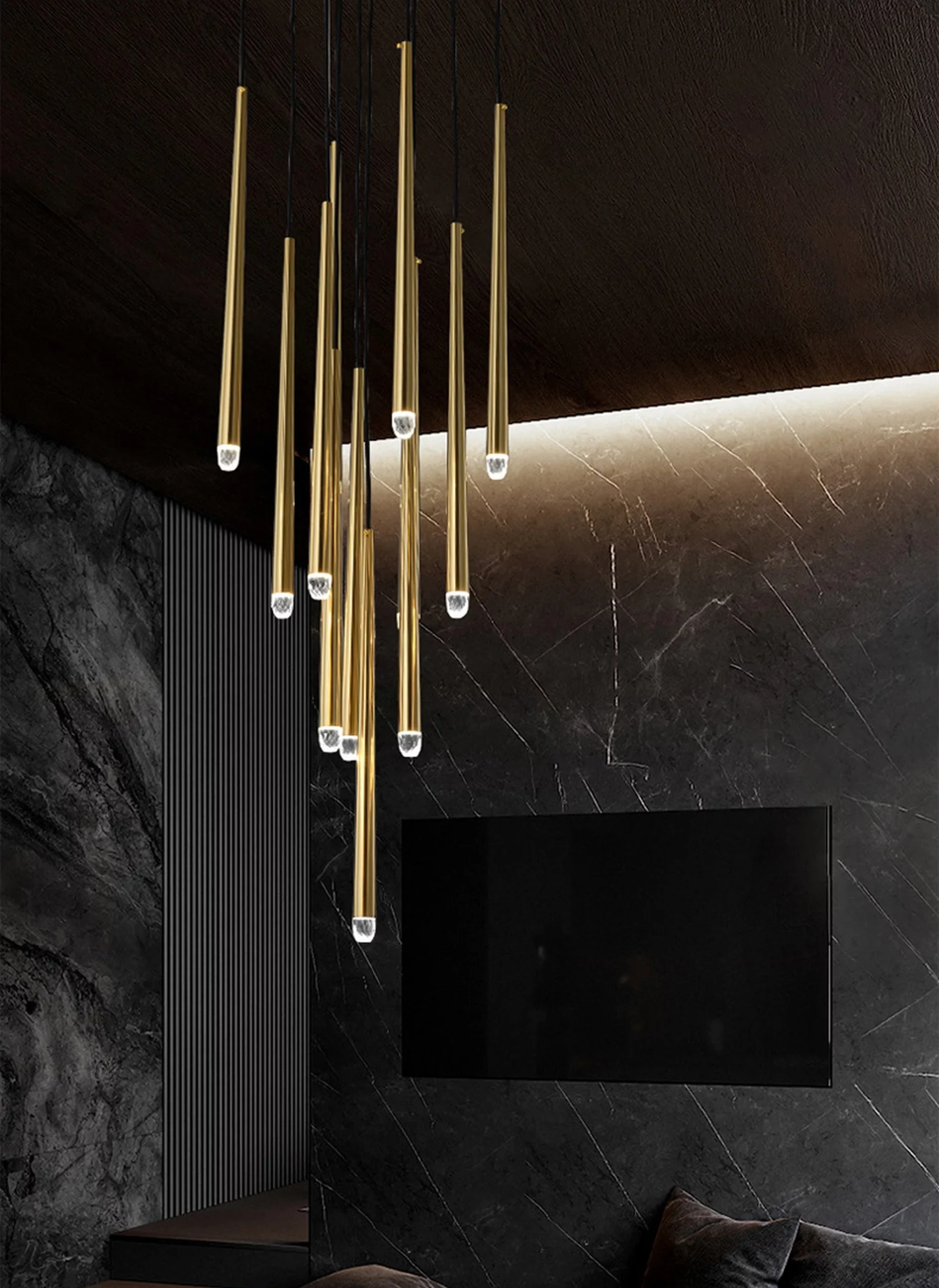 Check out the Aquitaine Long Chandeliers. These chandeliers are suspended from slender black cords and feature faceted glass tips that offer warm, glowing light.