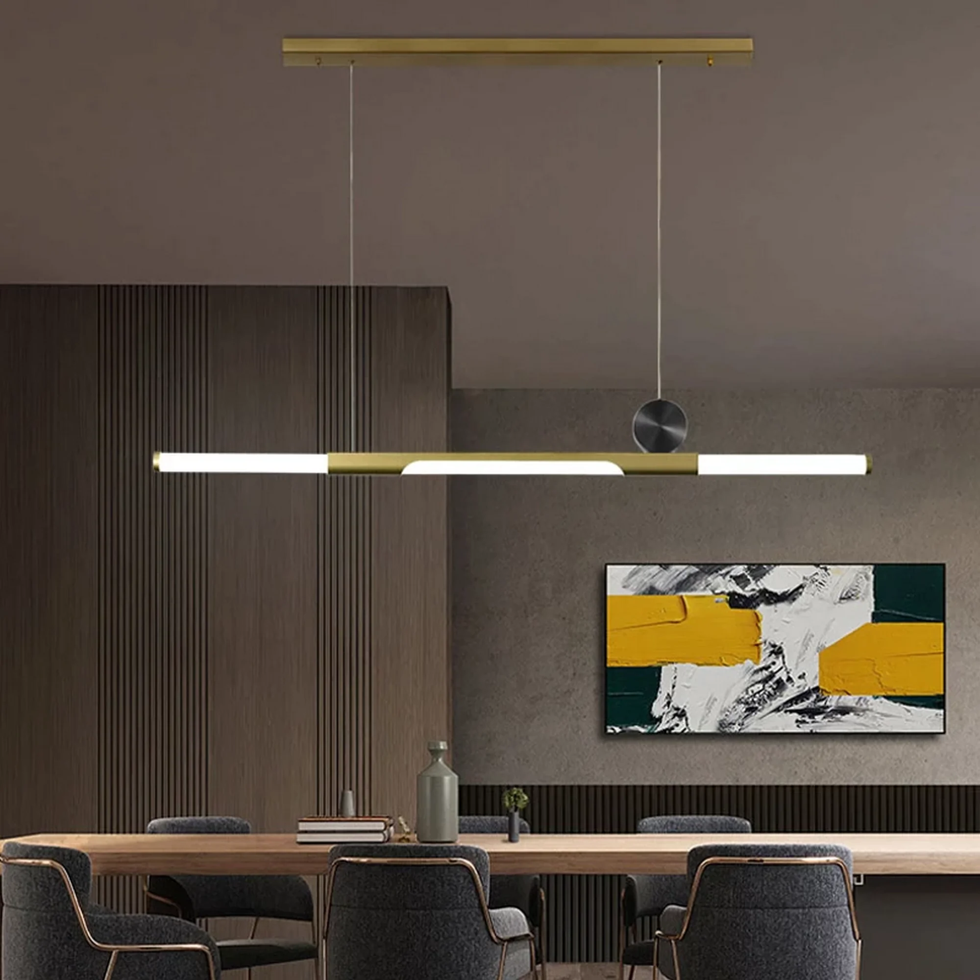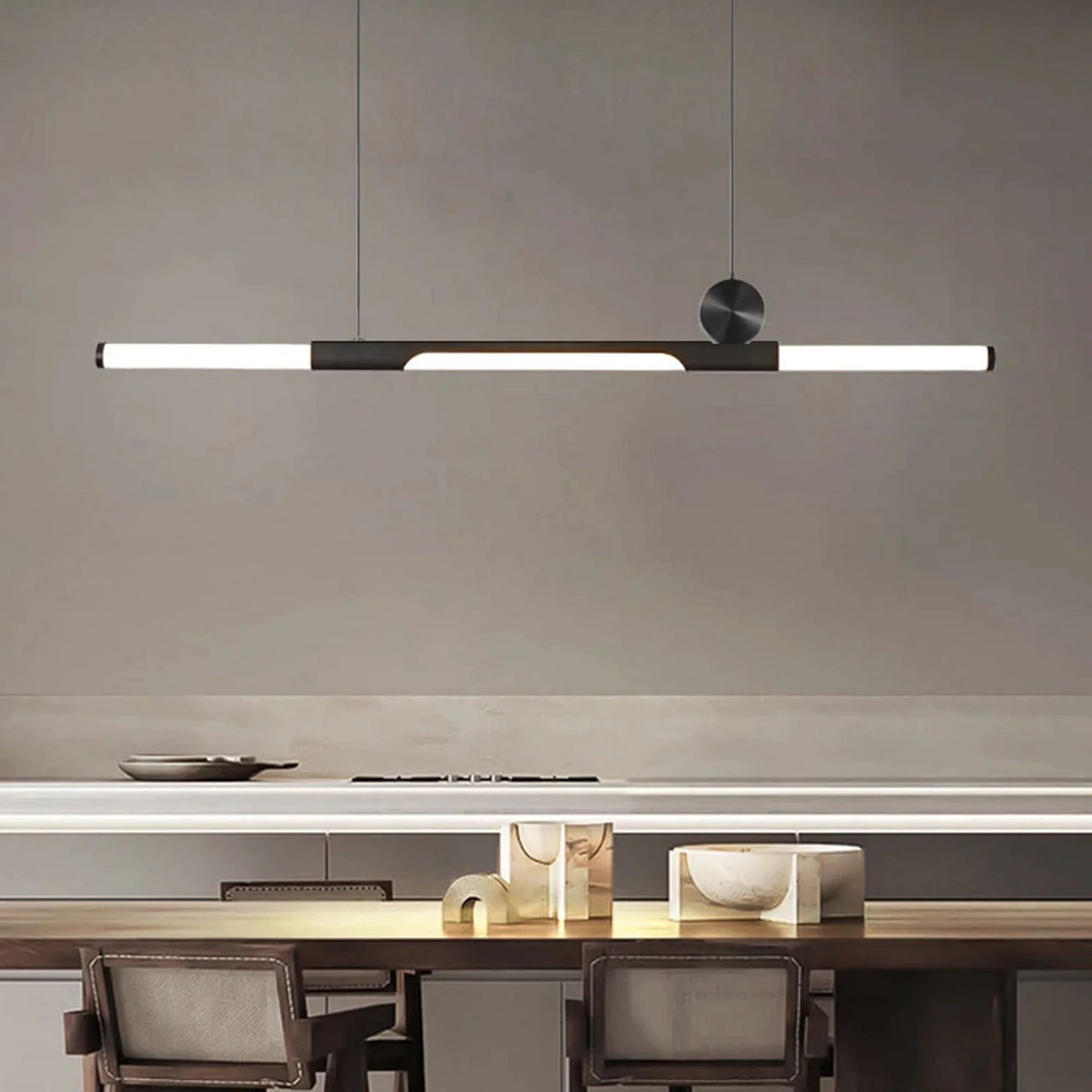 Crafted with meticulous attention to detail, the chandelier boasts a striking juxtaposition of bold black and luxurious gold, creating an alluring visual contrast that captures attention from every angle. Its thick bar design adds a touch of architectural elegance, allowing it to seamlessly integrate with a variety of modern interior styles.