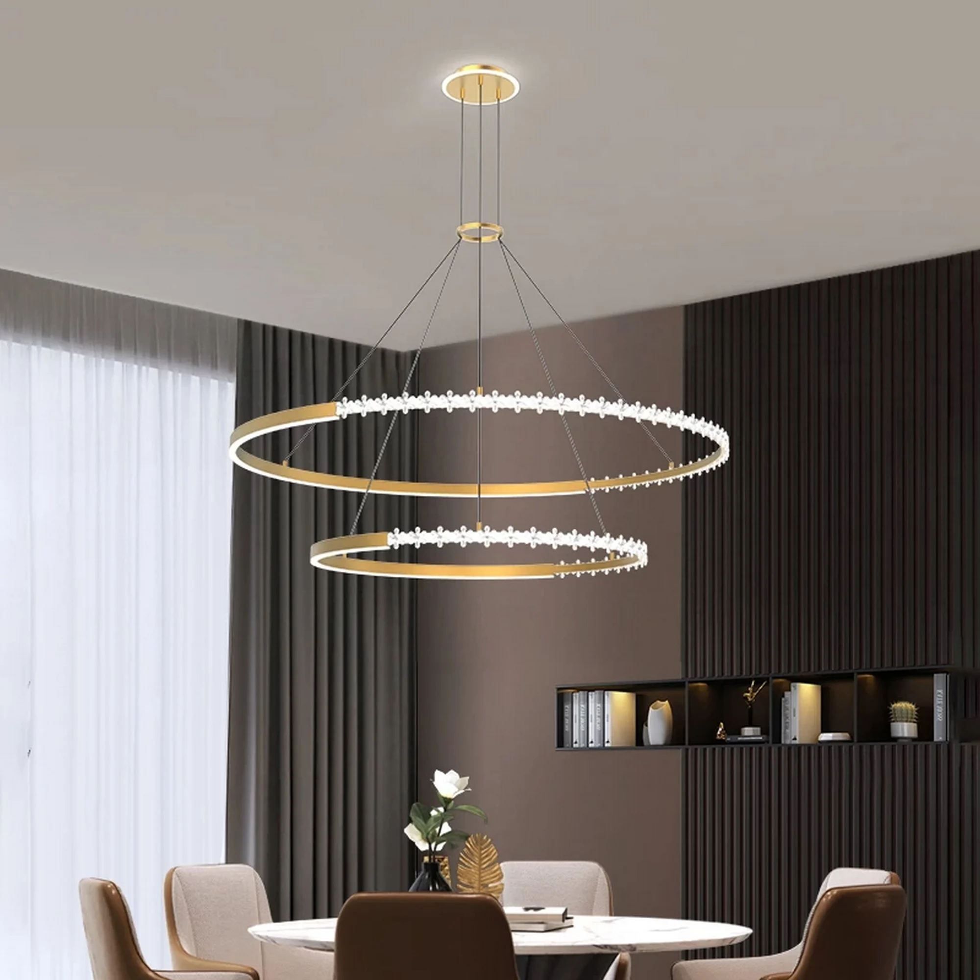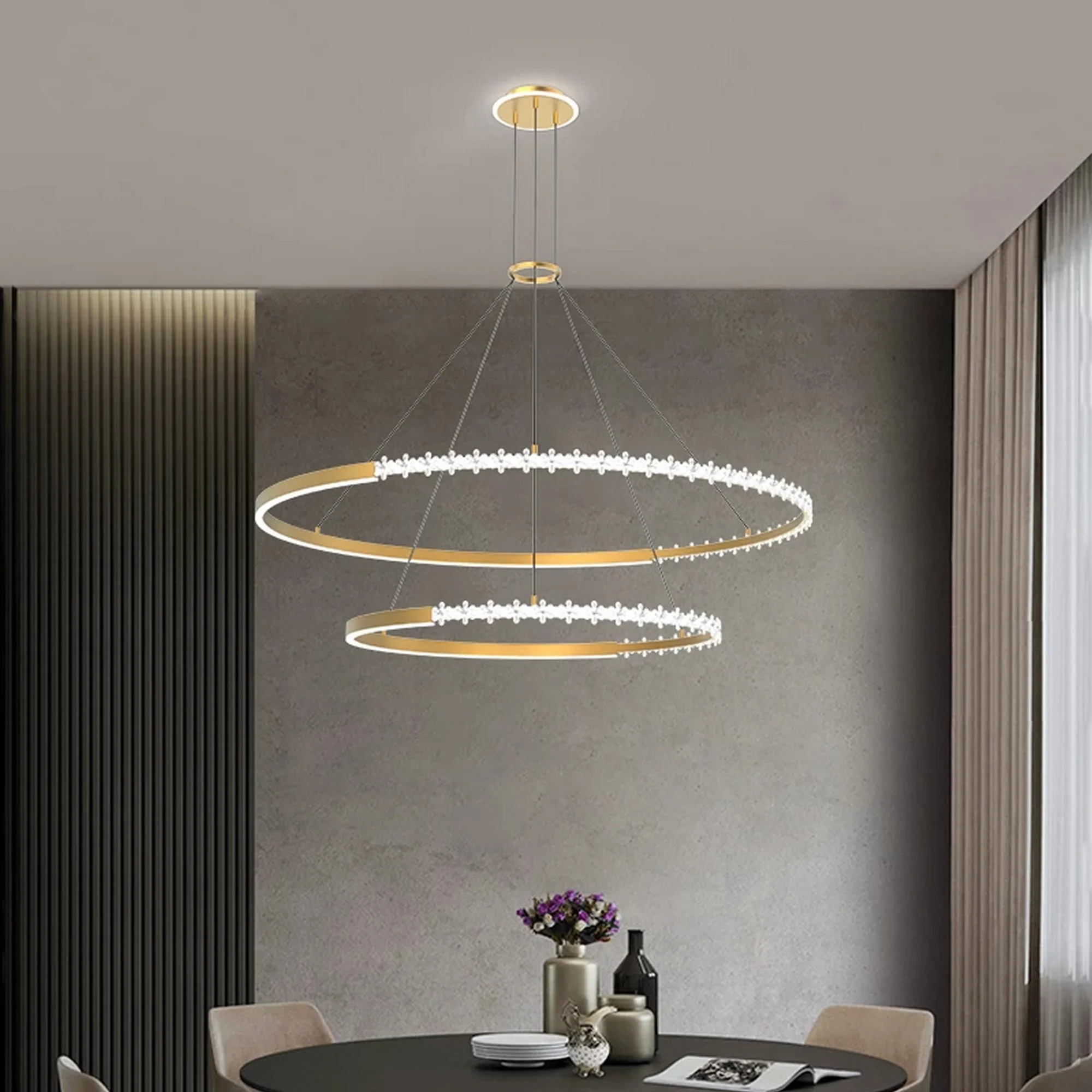 The Double Layer Ring LED Chandelier is also incredibly versatile. It can be used as a single statement piece, or grouped together to create a more dramatic effect. It is perfect for modern or traditional spaces, and its minimalist design ensures that it will never go out of style.