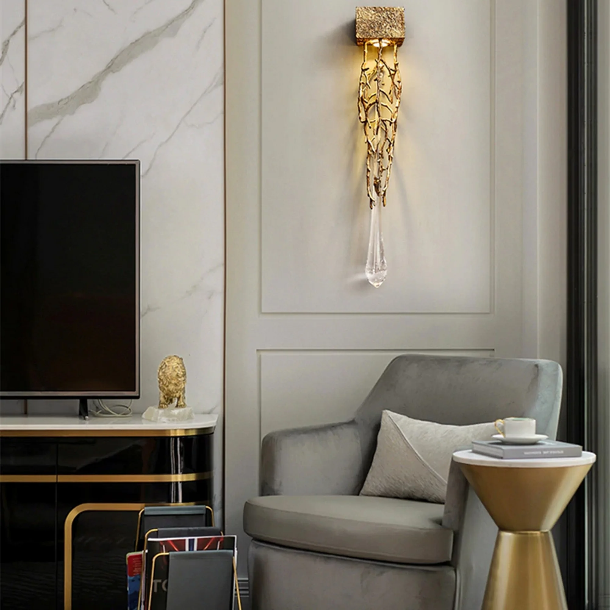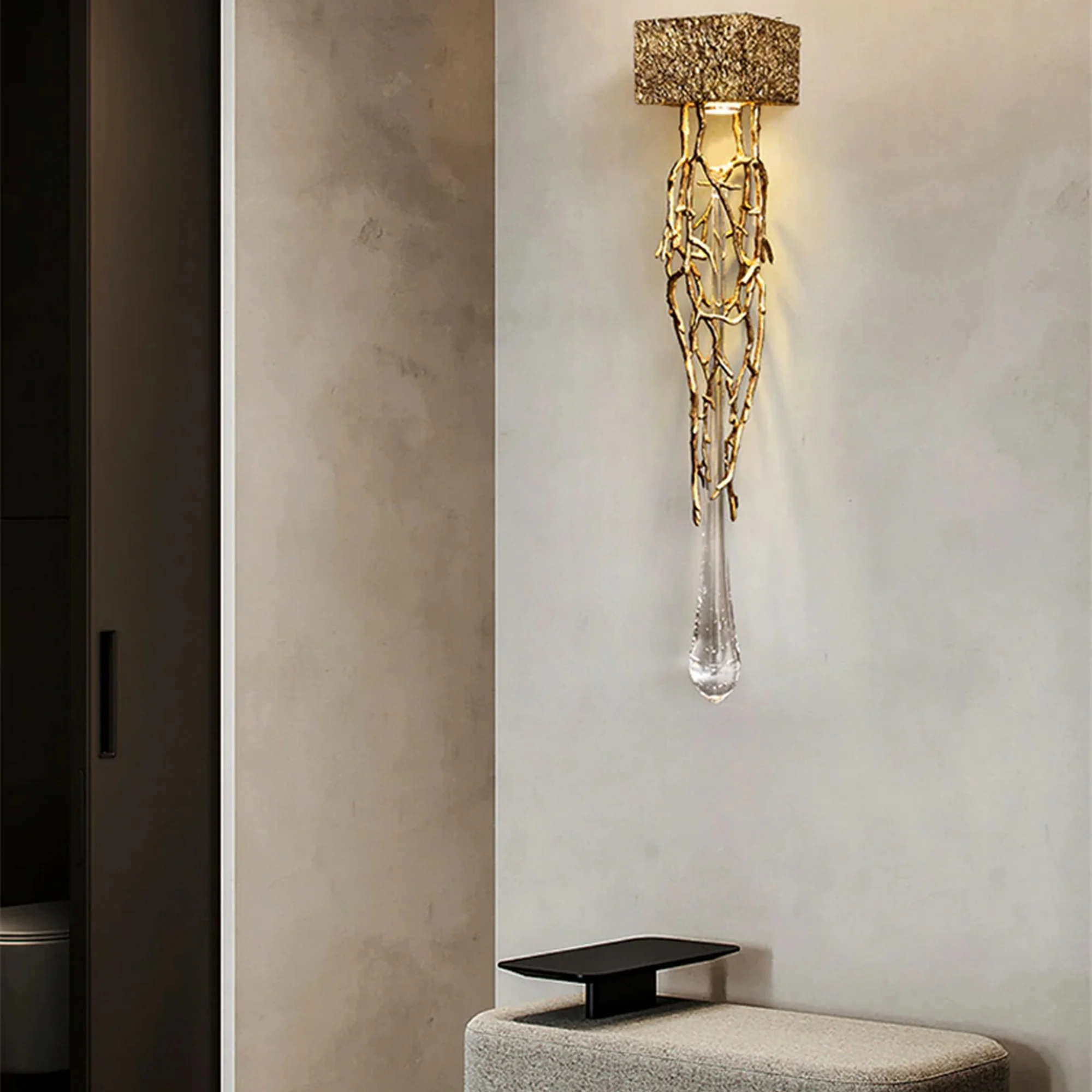 Introducing our Creative Art Crystal Drop Wall Lamp, a stunning piece of decor that will add a touch of elegance and sophistication to any room in your home.