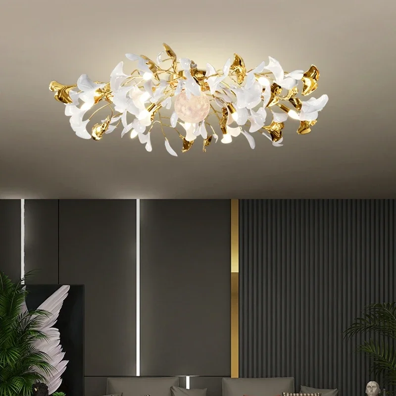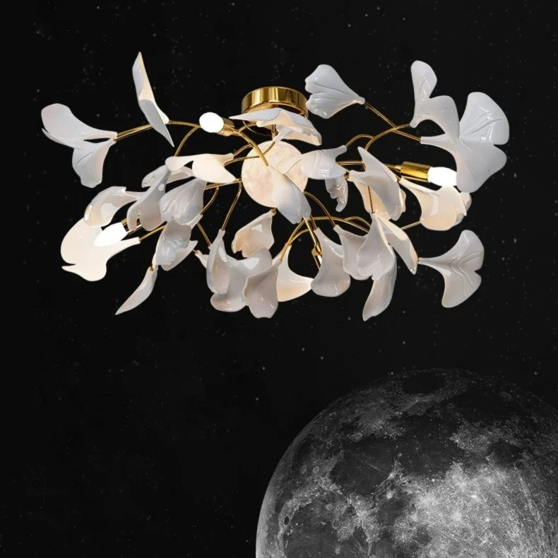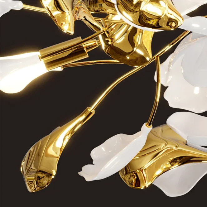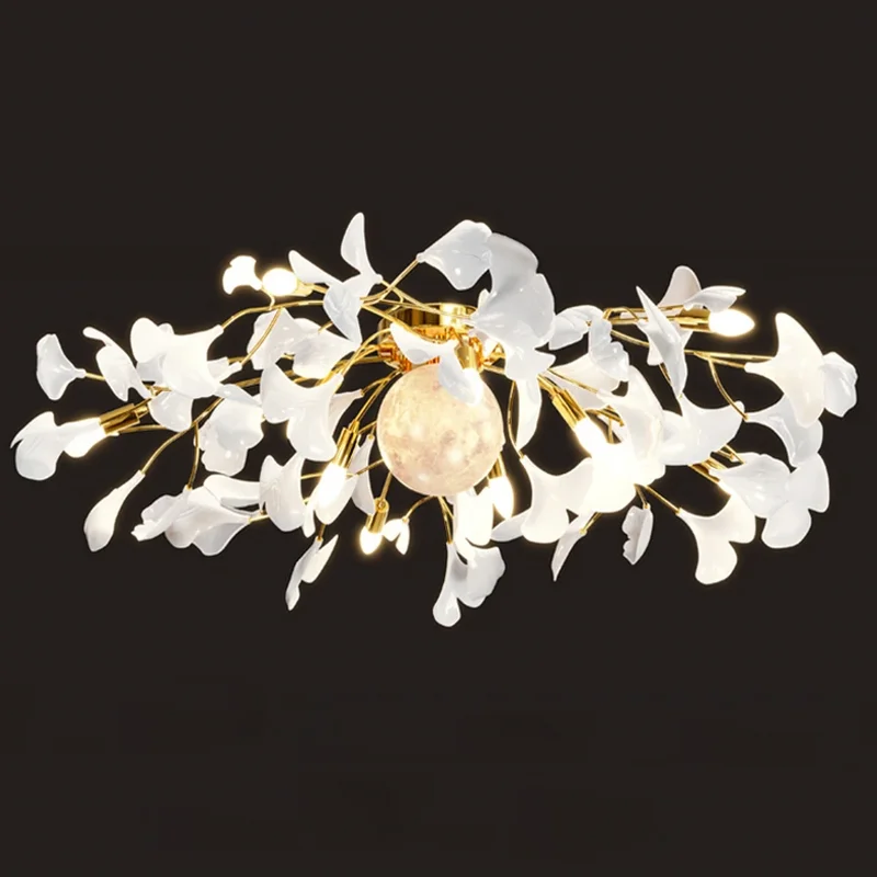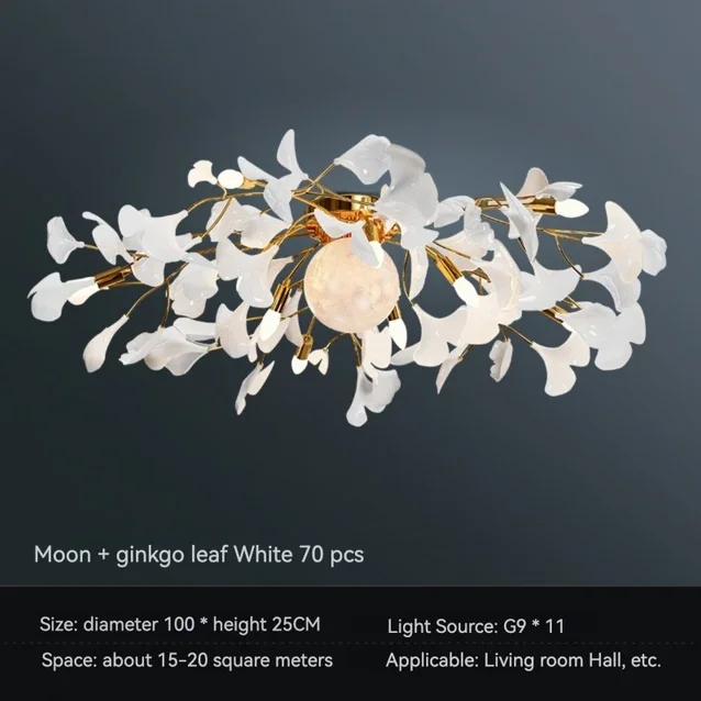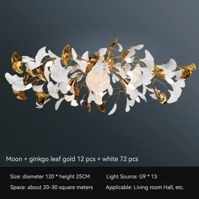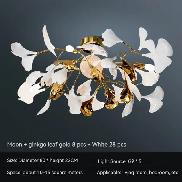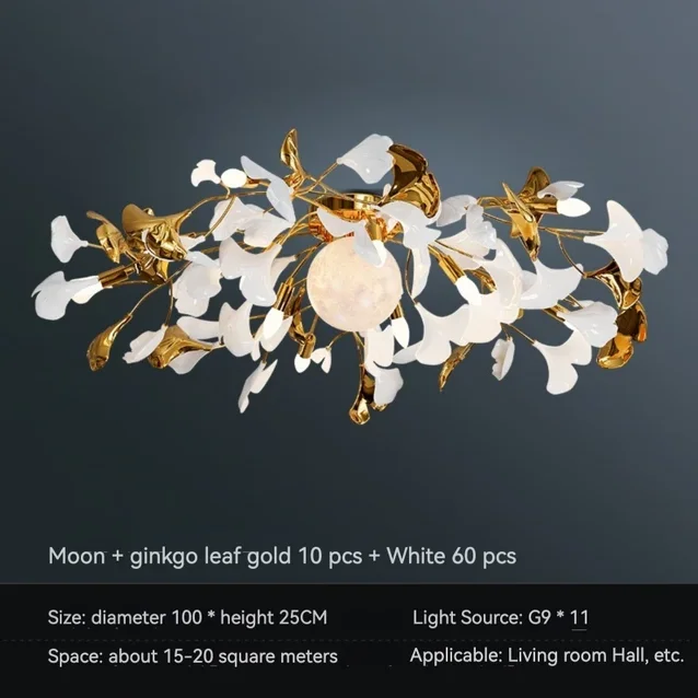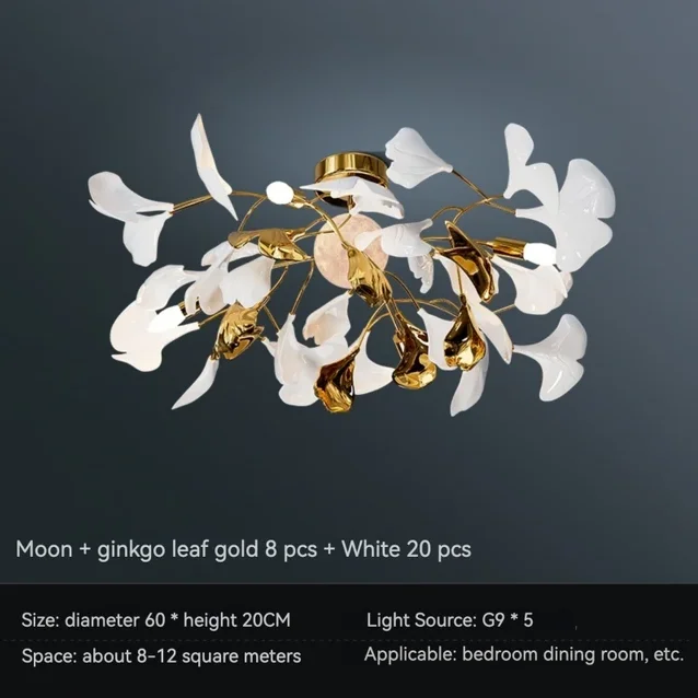 The Ginkgo Leaf Art Ceiling Chandelier features a captivating design, with delicate metal branches adorned with intricately crafted ginkgo leaves. Each leaf is meticulously sculpted to capture the natural beauty and intricate texture of the foliage, creating a mesmerizing visual display reminiscent of a forest canopy.