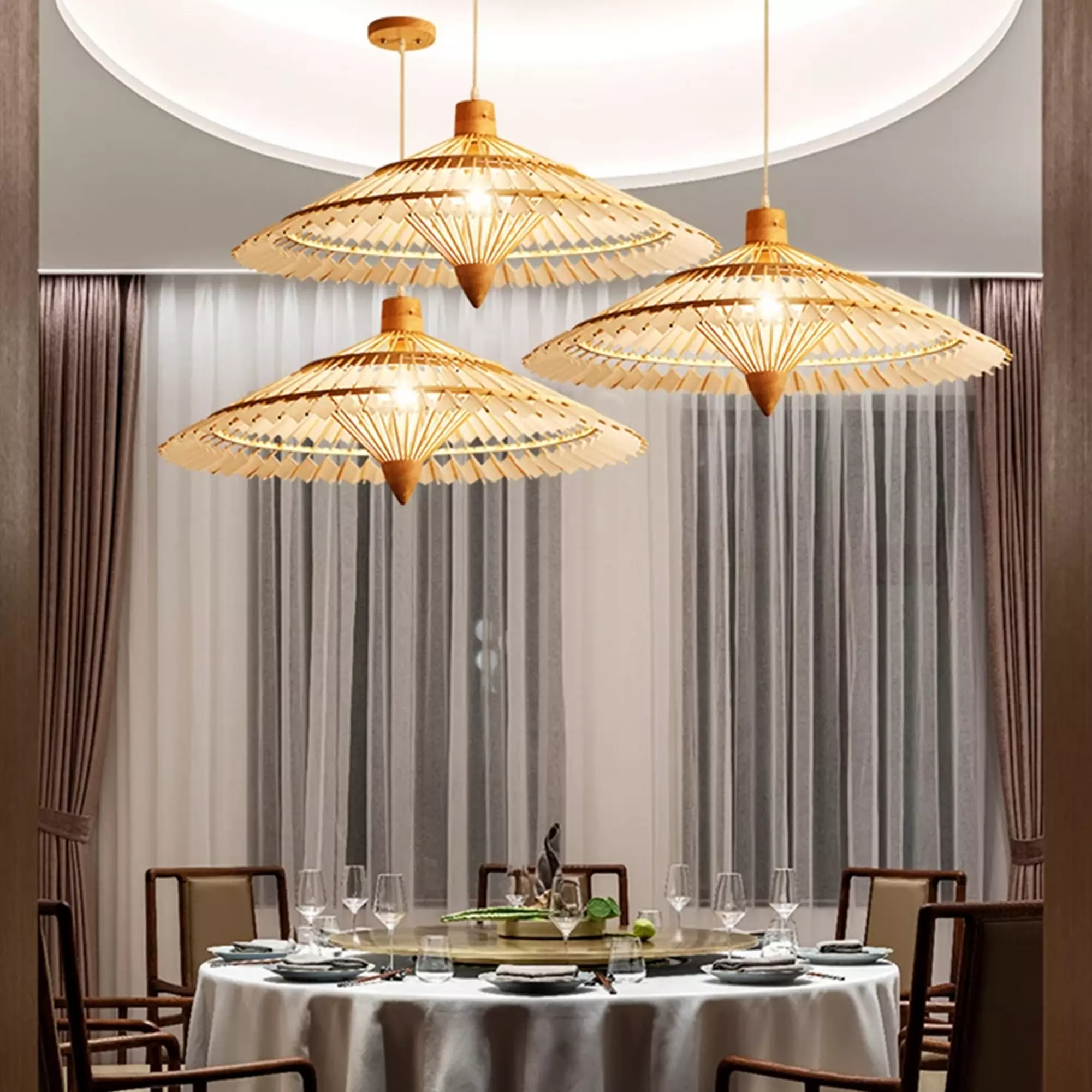 Crafted with attention to detail and a commitment to sustainability, this pendant light effortlessly blends form and function. The round shape and woven bamboo design create a mesmerizing play of light and shadows, infusing your space with a warm and inviting ambiance. The natural texture of the bamboo adds a touch of rustic elegance, perfect for enhancing your dining area, kitchen, or living room with a unique and eco-friendly lighting solution.
