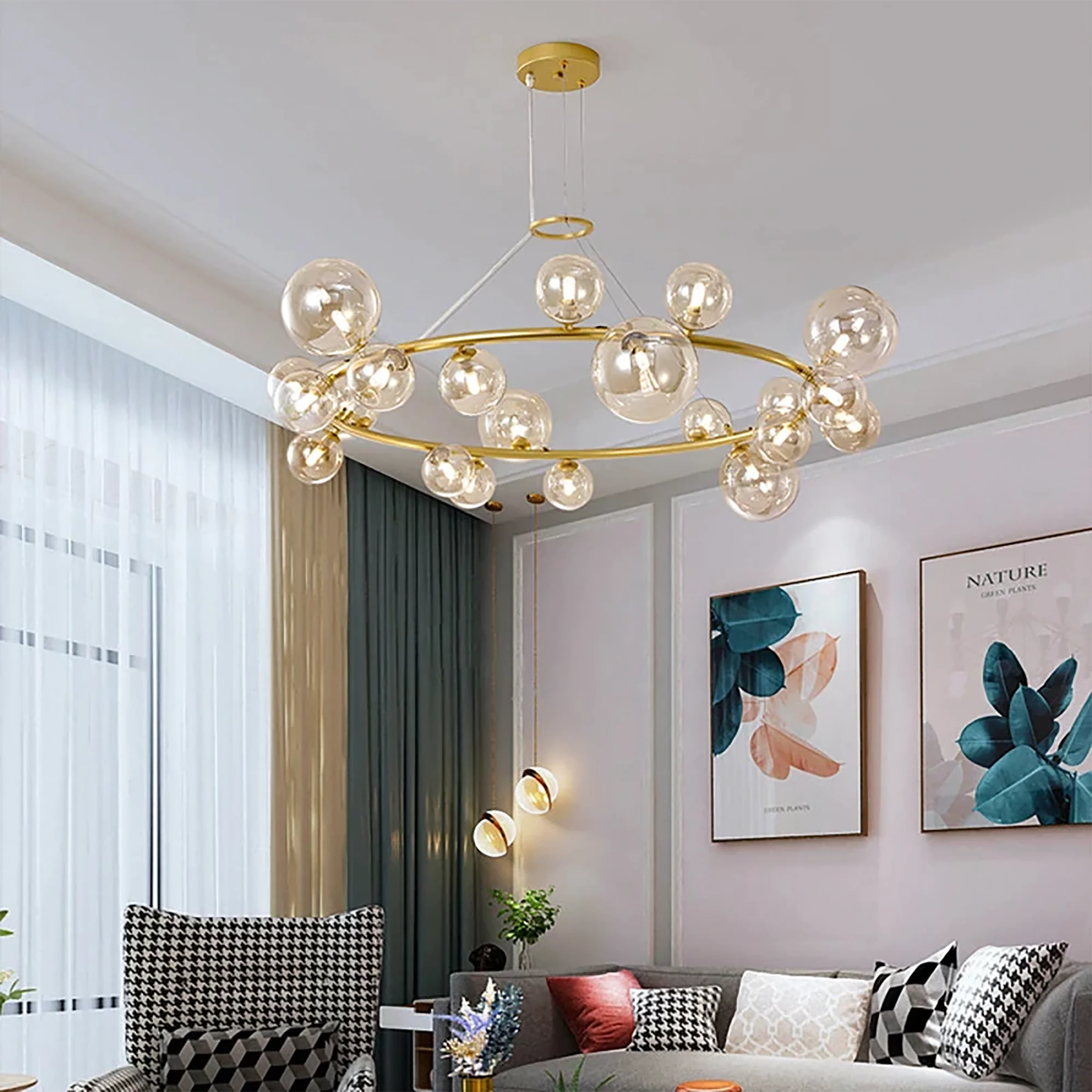 Graceful and mesmerizing, this chandelier is a captivating masterpiece that exudes an air of understated elegance. The delicate glass balls dance effortlessly, creating a harmonious symphony of light and shadows that will enchant your space.